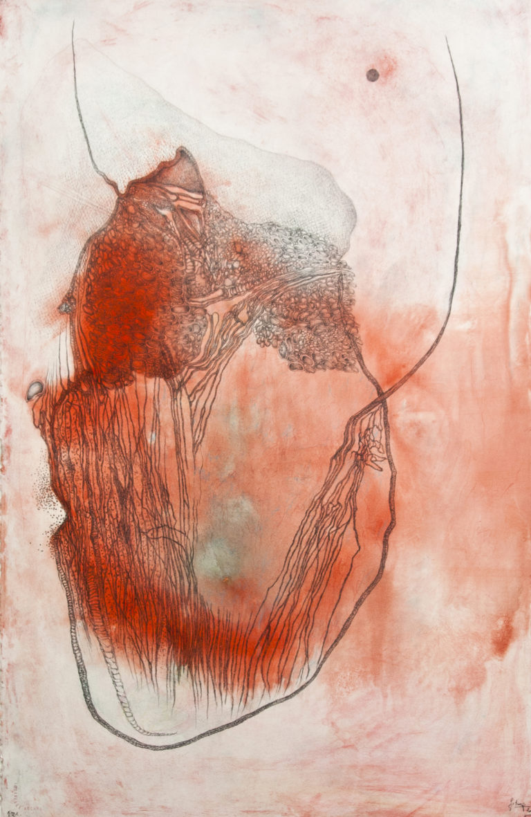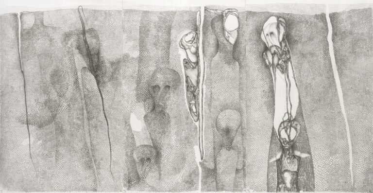 Ses dessins, d’une précision presque obsessionnelle, donnent naissance à des formes organiques en constante métamorphose. Figures humaines, anatomies imaginaires et paysages intérieurs se mêlent dans un univers graphique intense, nourri par une réflexion profonde sur la vie psychique et les forces qui traversent l’être.